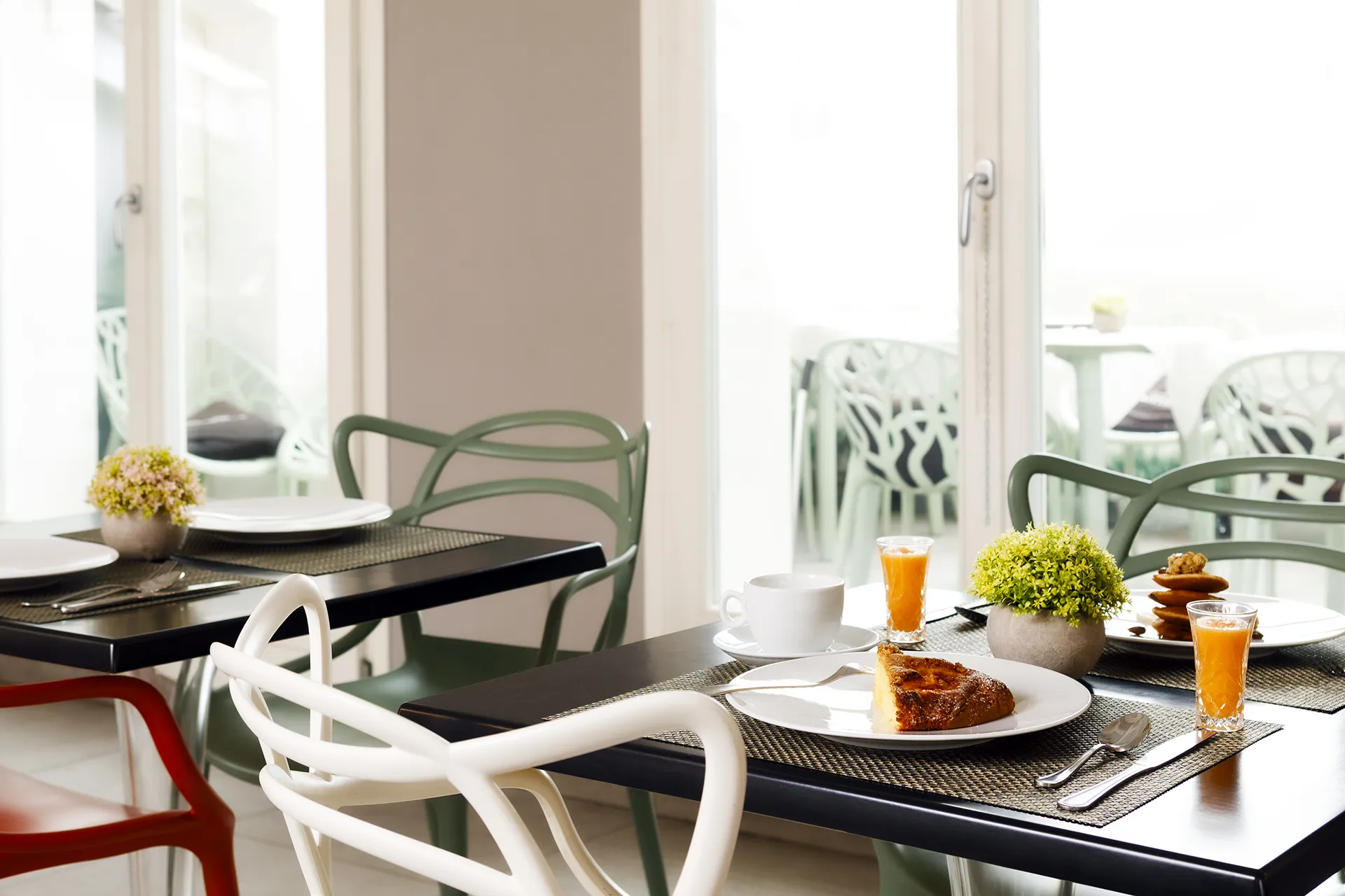 Tavolo apparecchiato per la colazione in un ambiente moderno, con piatti contenenti pancake e una fetta di torta, tazze di caffè, bicchieri di succo d’arancia e piccoli centrotavola floreali. Sullo sfondo si vedono altre sedie colorate e tavoli disposti in fila, in una sala luminosa con pareti chiare e lampadine decorative sospese.